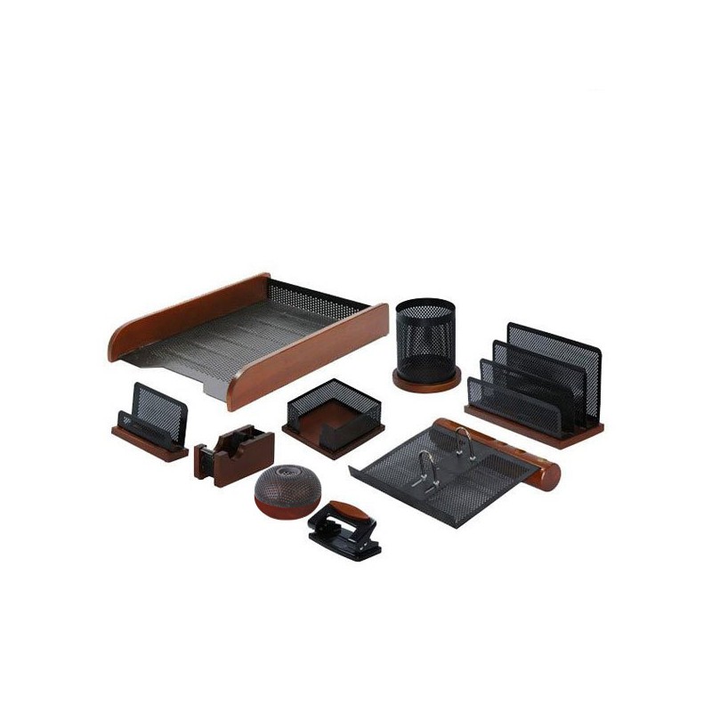 اقلام موجود در بسته شامل کازیه یک طبقه - پایه تقویم رومیزی - جای پاکت نامه - جا کارتی - جاچسبی - جای کاغذ یادداشت - جا سوزنی (گیره) - جامدادی رومیزی - پانچ