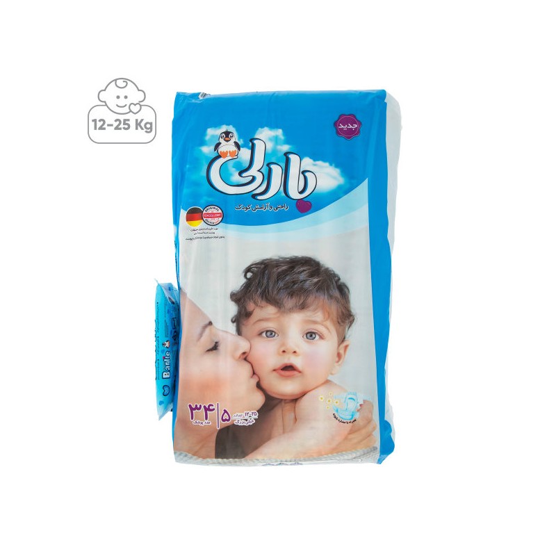 پوشک بارلی سایز 5 بسته 34 عددی به همراه دستمال مرطوب|سرویس ویژه 7 روز تضمین بازگشت کالا