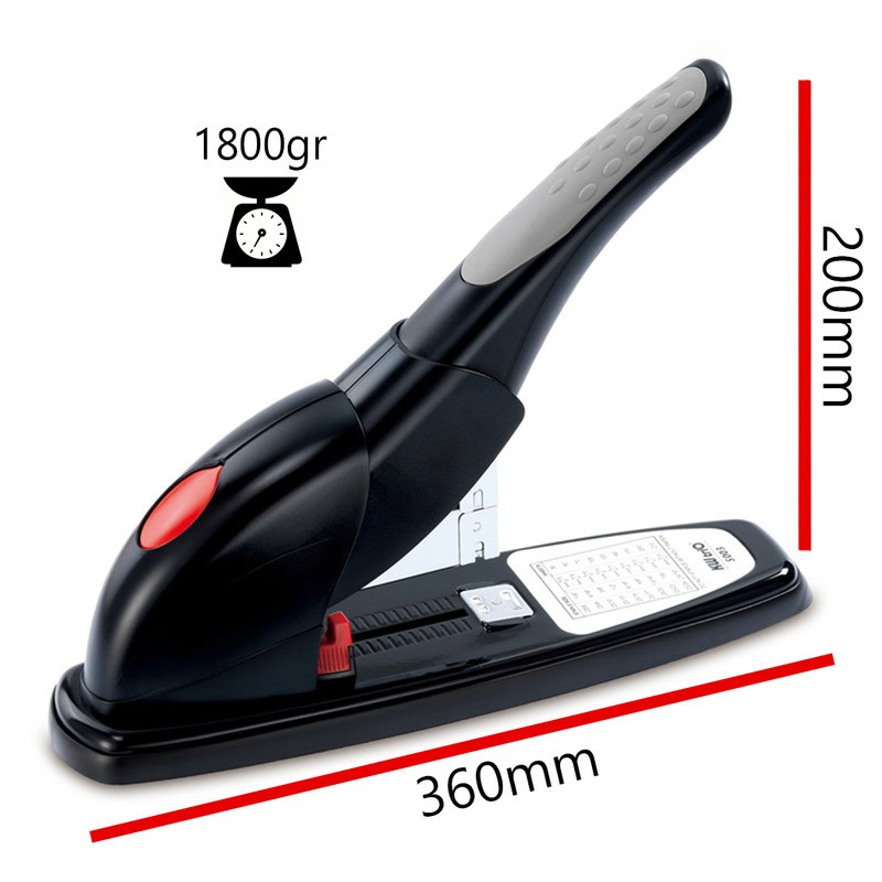 - شاسی تمام فلزی - پایه ضد لغزش - دسته از جنس فایبر گلس بسیار بادوام - سایز سوزن مصرفی ۲۳/۶ - ۲۳/۸ - ۲۳/۱۰ - ۲۳/۱۳ - ۲۳/۱۵ - ۲۳/۱۷ - ۲۳/۲۰ و ۲۳/۲۳ - منگه حداکثر ۲۰۰ برگه کاغذ ۸۰ گرم - عمق زیر منگنه ۲۵ سانتی متر - سایز بزرگ ویژه صحافی - دارای راهنمای عمق منگنه کردن قابل تنظیم از ۱ میلی متر تا ۲۵۰ میلی متر - دارای دفترچه راهنما داخل بسته ساخت کشور تایوان